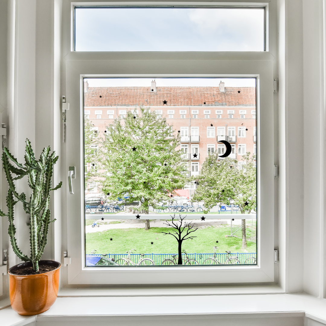 Herbruikbare raamstickers - Grachtenpand uitbreiding herfst/winter boom